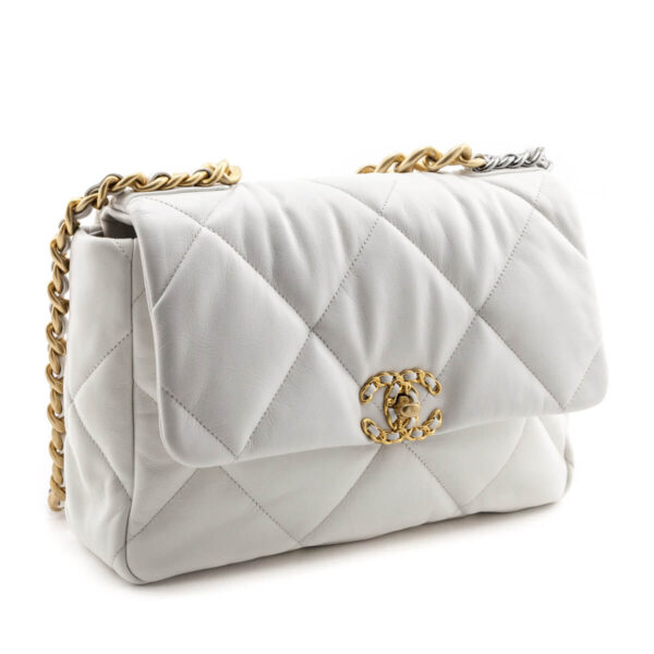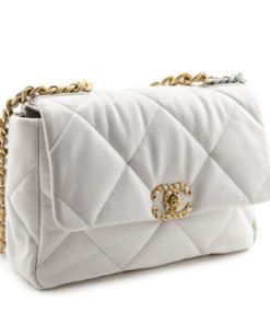 Chanel’s current “It” style, this Medium Chanel 19 Flap Bag is the ultimate neutral-toned statement bag. A crisp white makes up the exterior of this Chanel treasure.