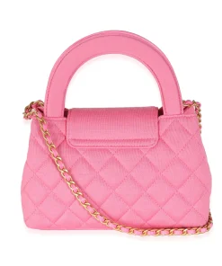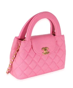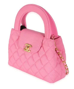 It’s a pink CHANEL Jersey Quilted Nano Kelly Shopper. With its long crossbody chain strap, this little bag is a modern take on an old-fashioned Chanel bag. This pink fabric bag with two top handles is adorned with vintage gold hardware and features a Chanel CC turn-lock at the flap. This reveals a small, pink leather interior with a zippered pocket and a patch.