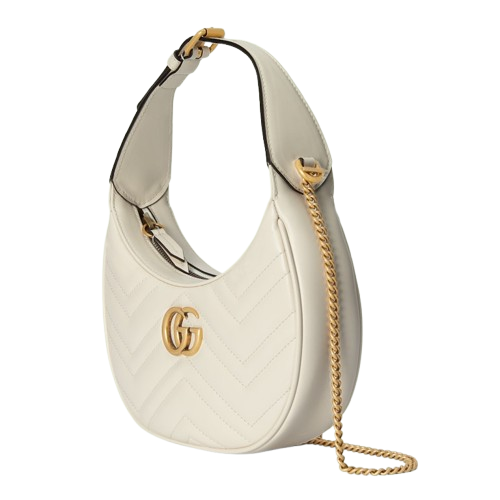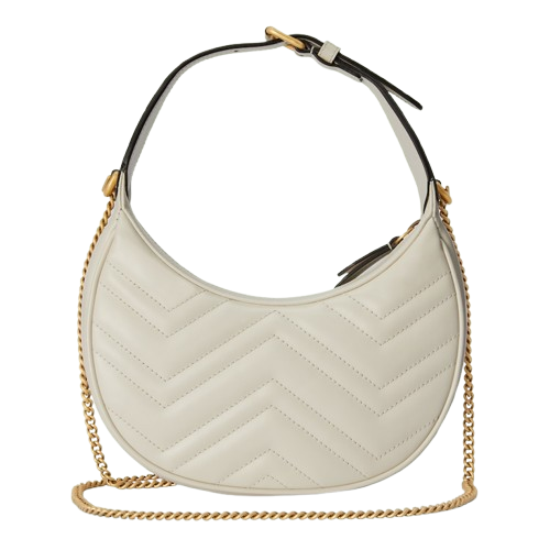 This little purse has a distinct throwback vibe thanks to its textured white leather and crescent silhouette. By fusing old components with archive codes or modern features, each collection takes the viewer on a voyage through several decades and eras to produce new designs that transcend time and place. This fascination with the past, which permeates GG Marmont’s universe, is reflected in the little accessory.