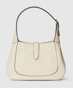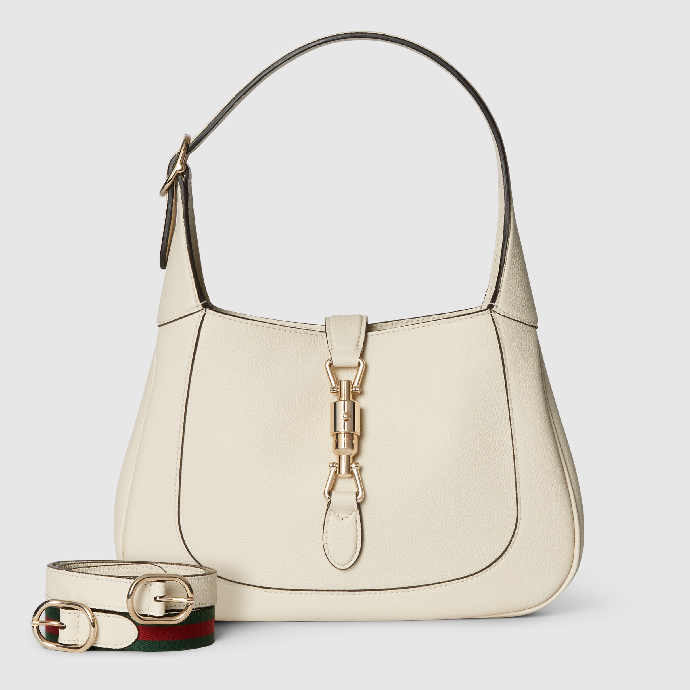 Featuring fine ivory leather and a new light gold-toned piston fastening, the Gucci Jackie 1961 shoulder bag from the Fall/Winter 2024 collection showcases the House’s classic handbag’s craftsmanship, crescent form and streamlined silhouette. For further design possibilities, this medium size comes with a leather strap in addition to an additional green and red Web strap.