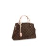 The bag looks pretty good real firm leather. The braided handle was a little short – difficult to carry with it. The shoulder strap looks pretty good. The LV bag charm is not complete. It is coming apart in the middle of the LV area on the bag charm -seems cheap! Good luck on your bag.