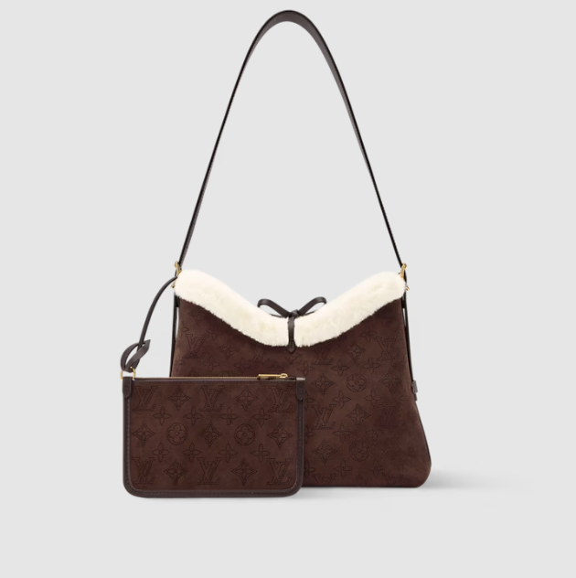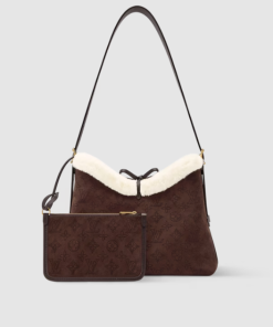 This LV Ski CarryAll PM is part of the Cozygram line and is made of smooth, velvety suede in a deep chocolate colour. This stylish and collectible purse has gold-toned hardware for a refined finish and contrasting shearling trim. It has several compartments inside to hold necessities and a signature name tag that may be taken off if you’d like.