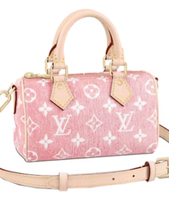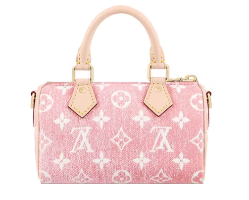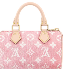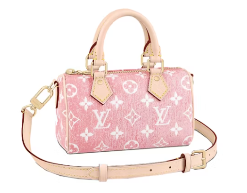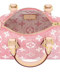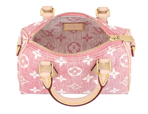 This is a pink Louis Vuitton Denim Monogram Nano Speedy Bandouliere. This chic, little tote is made of monogrammed jacquard denim from Louis Vuitton. The shoulder bag has a crossbody shoulder strap made of vachetta leather and vachetta cowhide rolled leather top handles with tiny polished brass links. An interior of pink monogram fabric is accessible through the top zip.