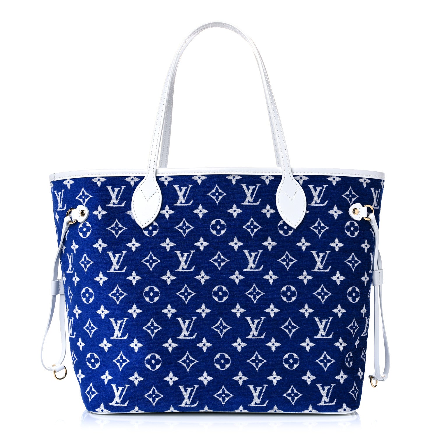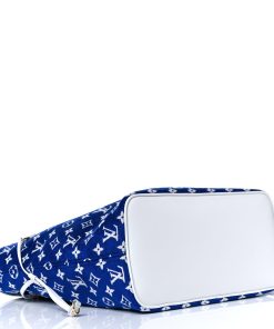 This is an LV Match Neverfull MM in blue with a Louis Vuitton jacquard velvet monogram. The Louis Vuitton Pre-Fall 2022 “Match” collection includes this premium tote that has been previously owned. This chic tote has the iconic Louis Vuitton monogram in a striking blue and white design. The bag has polished brass hardware, side cinch cords, trim, and shoulder straps made of vachetta cowhide leather. A white monogrammed cloth interior with a zipped pocket is accessible through the wide top.