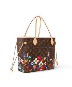 As part of the Louis Vuitton x Murakami collection’s festive re-edition, this classic Neverfull MM handbag blends two legendary signatures. Reworked Monogram Flowers in Takashi Murakami’s famous superflat style are whimsically superimposed on the roomy Monogram canvas body. The interior is lined with vibrantly striped fabric, while the top, handles, and side ties are accentuated with natural cowhide leather. comes with a detachable pouch and an inside pocket that zips up.