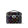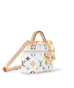The multicoloured Monogram motif from the Louis Vuitton x Murakami collection, which reimagines the House’s classic monogram in the artist’s unique colourful palette, makes a bold statement with the timeless elegance of the Vanity Pouch. It is made of coated canvas with natural cowhide leather trimmings, and it is completed with shiny golden hardware that includes a zipper closure, a detachable chain, and a padlock that is etched with the LV logo.