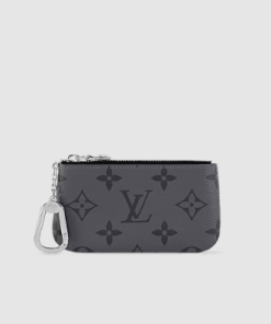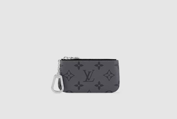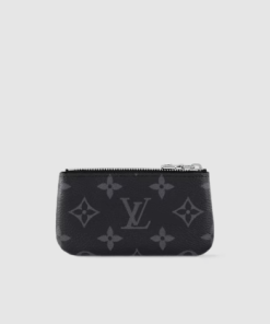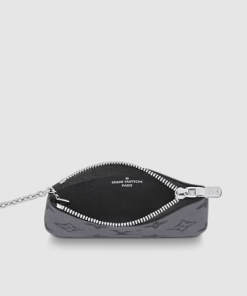 One side of this key pouch is composed of Monogram Eclipse canvas, while the other side is composed of lighter Monogram Eclipse Reverse. It’s perfect for holding keys and other tiny items like coins, cards, and cash. It has a chain and hook to attach it to a belt or bag, and it is fastened with a zip pull that is etched with LV.