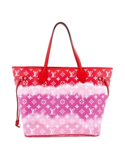 This is a Rouge Monogram Escale Neverfull MM from Louis Vuitton. With a multicoloured cascading background and larger and smaller white monograms on either side, this limited edition tote is made on monogrammed coated canvas. The tote has silver hardware, side cinch straps, and red leather strap handles. The top closes with a clasp and reveals a roomy interior of red monogrammed cloth with a hanging zip pocket.