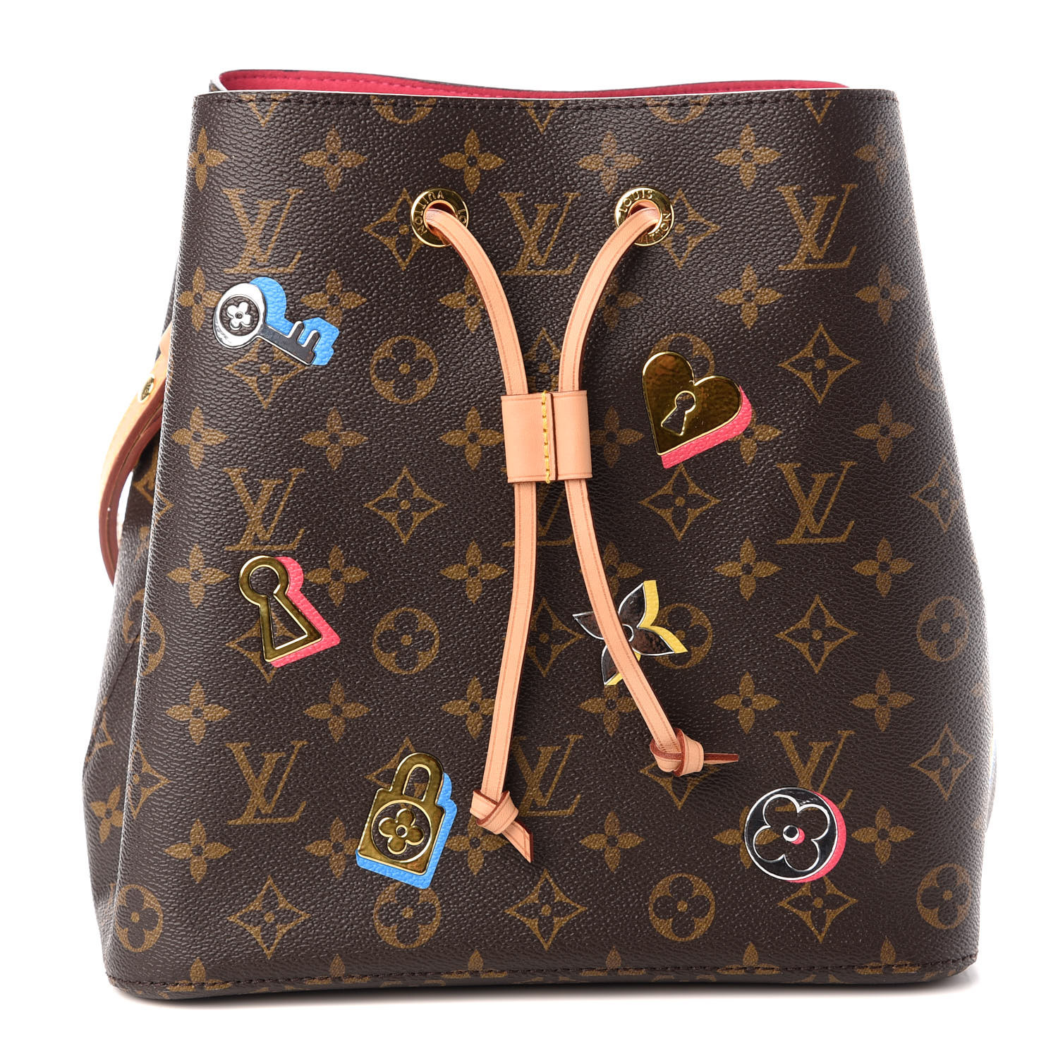 The Monogram Love Lock Neonoe is designed by Louis Vuitton. The iconic brown Damier-coated canvas of Louis Vuitton, adorned with a colourful charms print overlay, is used to create this timeless bucket-style shoulder bag. The bag has a top cinch strap with polished brass hardware and an adjustable leather shoulder strap. This opens to a microfiber interior with a center zipper pocket to keep you organized.
