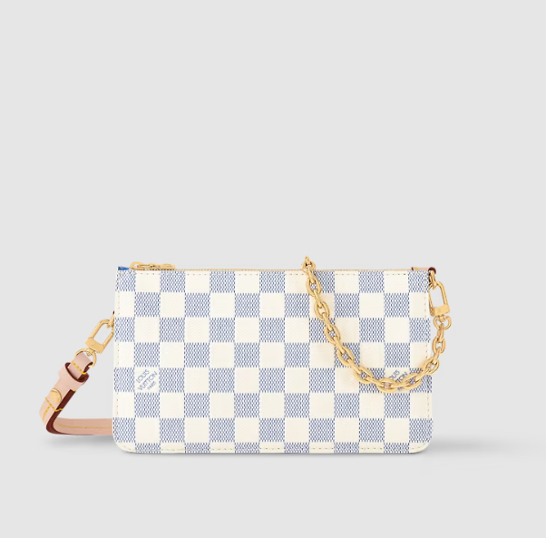 The Lexington pouch makes its debut in the Spring/Summer 2024 collection by Louis Vuitton. It is made from Damier Vernis patent calfskin that has been embossed with the renowned Damier pattern after being printed. This small bag is straightforward and well-made, with a detachable gold-tone chain and a natural leather shoulder strap for several carrying possibilities.