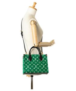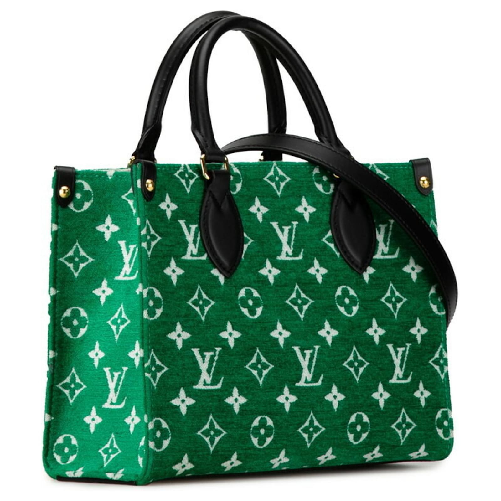 This is an Onthego PM Green Louis Vuitton Jacquard Velvet Monogram. This stylish handbag is expertly made from green Louis Vuitton monogram velvet. Black leather trim, leather top handles, and an optional leather shoulder strap with gold hardware are all elements of this bag. The white cloth interior with patch pockets and a zipper is accessible from the open top.
