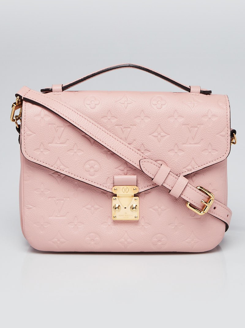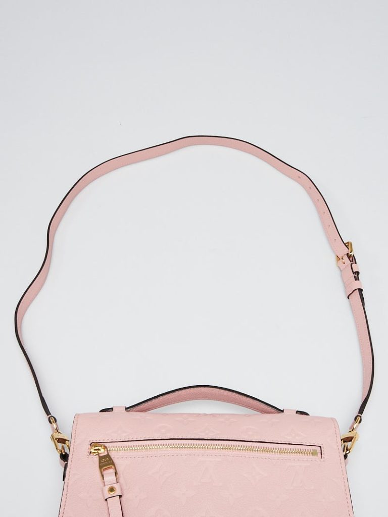 The pink Pochette Metis from Louis Vuitton demonstrates its elegance and compactness. The bag is made with suspicious Monogram Empreinte leather that gives it an impression of noblesse and it will be a wise choice for women today. The pochette Metis measures 25.0 cm in length, 19.0 cm in height, and 7.0 cm in width (equivalent to 9.8 x 7.5 x 2.8 inches) thereby providing a pocket-sized pocket Small-sized, it has an elegantly laid out interior with many pockets. This makes it easier for you to store the essentials in an orderly fashion and style, making it a great travelling companion.