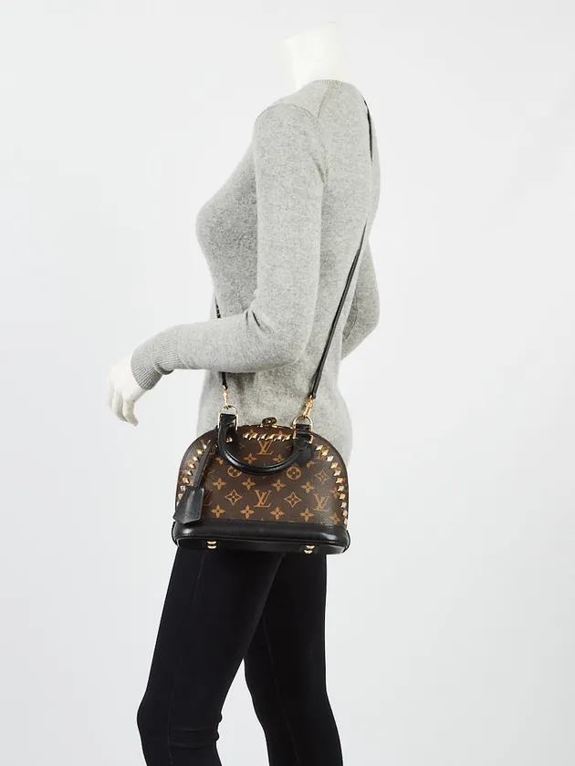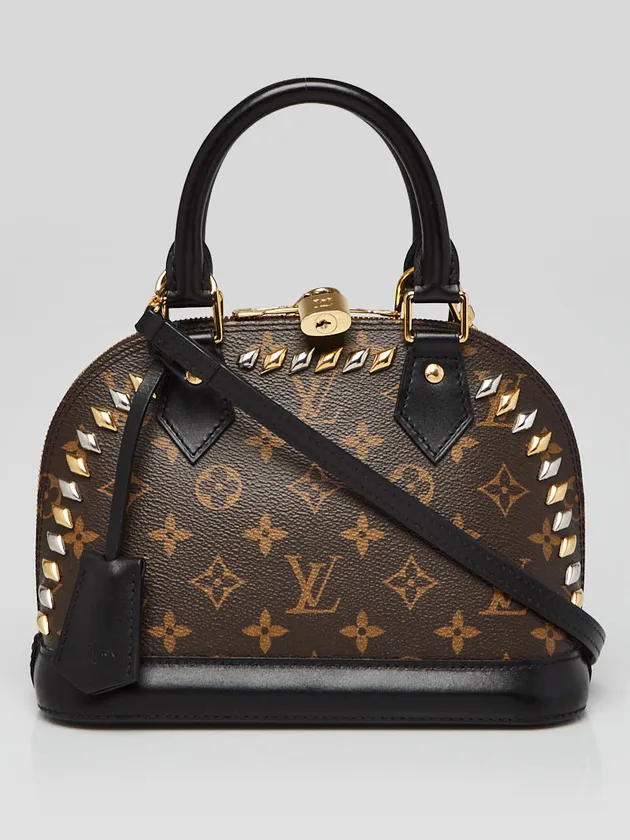 This is an Alma BB with a Louis Vuitton monogram and macassars. This little bowling-style tote is made of canvas with a Louis Vuitton logo. The bag has polished brass hardware, silver and brass studded decoration along the edge, black leather base, black rolled leather top handles, and an optional leather shoulder strap. The top zippers unzip to reveal a patch pocket and brown cloth within.