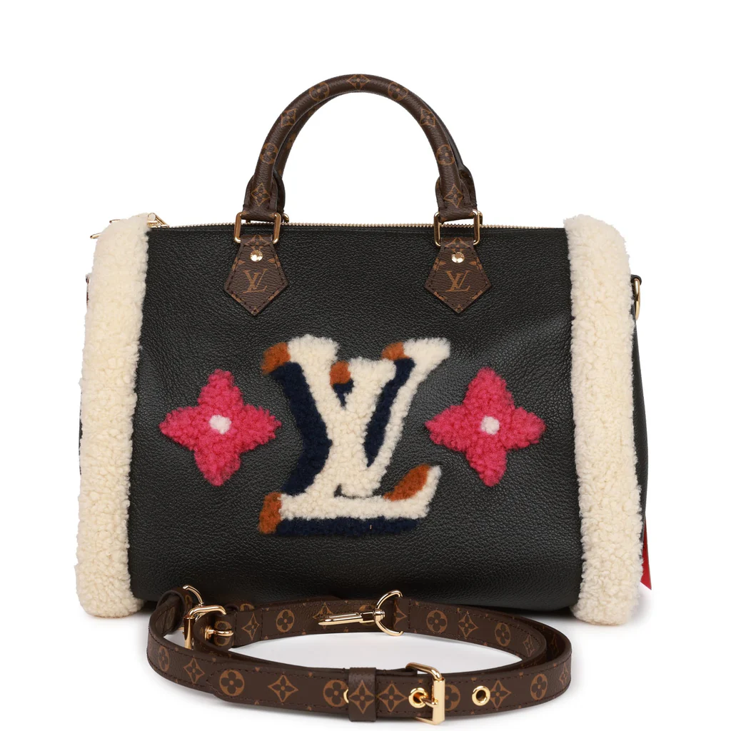This limited-edition Speedy 25 Bandouliere has a zip-top closure, brown canvas top strap handles, trim, and a large monogrammed shearling. It is made of black leather and shearling wool and has polished brass hardware.